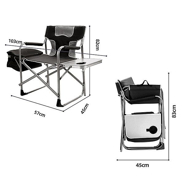 사이드 테이블과 아이스 백("감독 의자"라고도 함)이있는이 기능성 캠핑 의자는 스테인레스 스틸과 600 폴리 에스테르 옥스포드 원단으로 만들어져 최대의 편안함과 내구성을 제공합니다. 음료를 넣어 테이블에 홀더,그리고 추위와 뜨거운 것 들을 그대로 유지 하는 데 얼음 주머니—튼튼한 의자를 유지 하기 위해 무거운 의무 강철 튜브. 오픈 사이즈 103*45*82 센치메터 여분의 편안함,접힌 크기 83*45 센치메터 쉽게 캐리 및 저장. 의자 무게 4.5 키로그램 강한 무게 용량 300 파운드. 캠핑,낚시,바베큐 및 공원에 이상적인 휴대용 및 소형 의자 또는 햇볕에 몸을 담그고 휴식을 취하십시오.