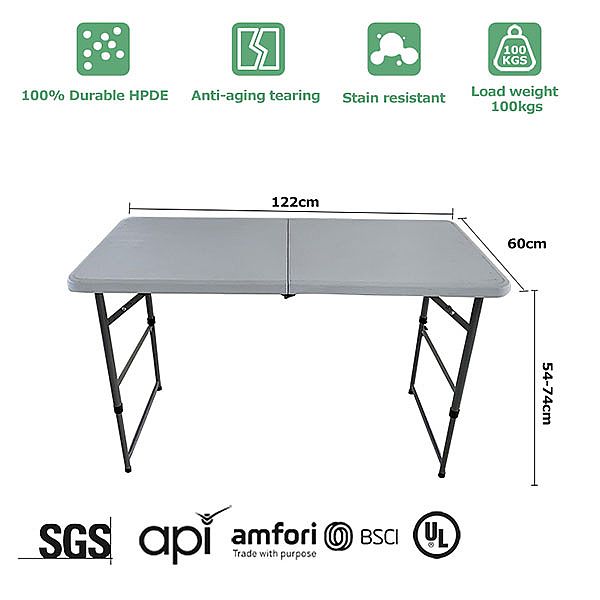 조정 가능한 야외 접이식 테이블은 야외 애호가에게 이상적인 선택입니다. 이 접이식 테이블은 3단계 높이 조절이 가능하며, 특정 요구와 취향에 맞게 사용자 정의할 수 있습니다. 절반으로 접는 디자인은 점유 공간을 줄입니다. 운반 손잡이의 디자인이 있어, 운반이나 보관이 간단합니다. 즉, 캠프 여행이나 피크닉, 심지어 공원에서 편안한 하루를 보낼 때도 쉽게 운반할 수 있습니다. 내구성이 뛰어난 HDPE로 제작되었으며 환경 친화적이며 고온 내성이 있습니다. 조정 가능한 야외 접이식 테이블을 사용하면 편안하고 쉽게 야외를 즐길 수 있습니다. 그 다용도와 적응성은 모든 야외 어드벤처에 필수적인 아이템입니다.